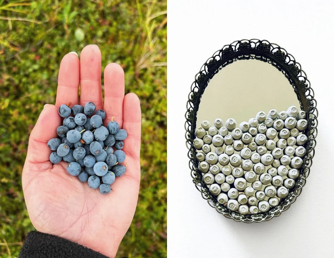 On the left, I carry a handful of freshly picked wild Alaskan blueberries. On the right is ‘ghost berries,’ where I formed blueberries into white clay to rest gently inside a frilly silver mirror.